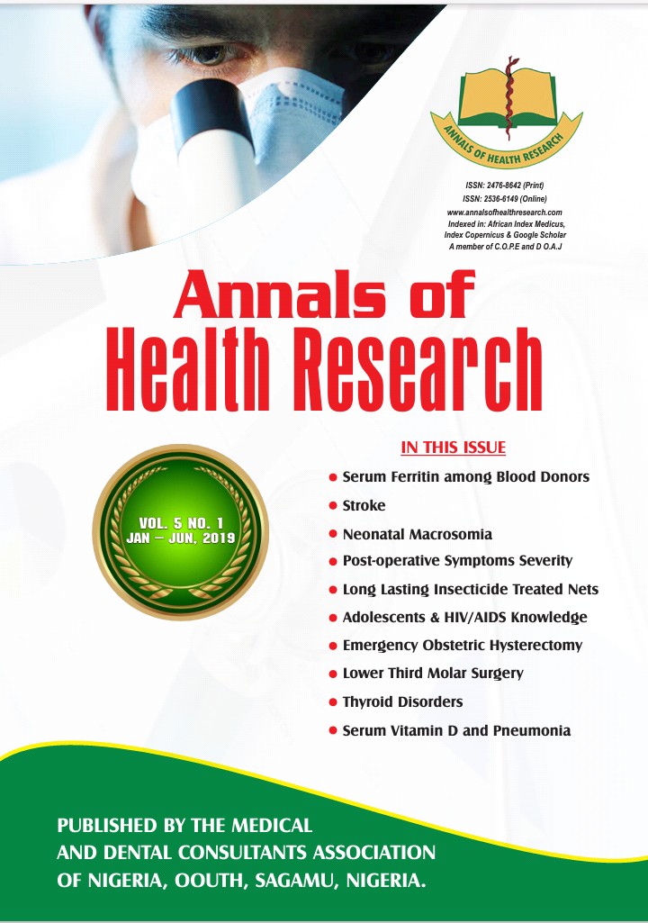 The articles and other materials published in the Annals of Health Research are protected by the Nigerian Copyright laws. The journal owns the copyright over every article, scientific and intellectual materials published in it. However, the journal grants all authors, users and researchers access to the materials published in the journal with the permission to copy, use and distribute the materials contained therein only for academic, scientific and non-commercial purposes.