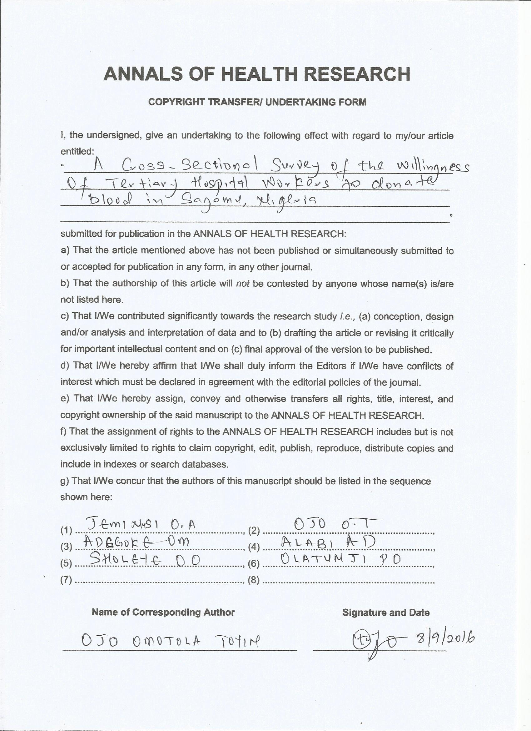 The articles and other materials published in the Annals of Health Research are protected by the Nigerian Copyright laws. The journal owns the copyright over every article, scientific and intellectual materials published in it. However, the journal grants all authors, users and researchers access to the materials published in the journal with the permission to copy, use and distribute the materials contained therein only for academic, scientific and non-commercial purposes.