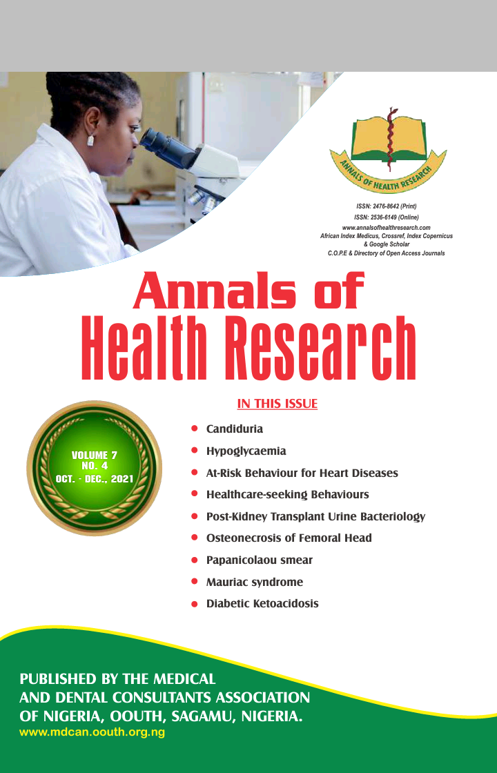 The articles and other materials published in the Annals of Health Research are protected by the Nigerian Copyright laws. The journal owns the copyright over every article, scientific and intellectual materials published in it. However, the journal grants all authors, users and researchers access to the materials published in the journal with the permission to copy, use and distribute the materials contained therein only for academic, scientific and non-commercial purposes.